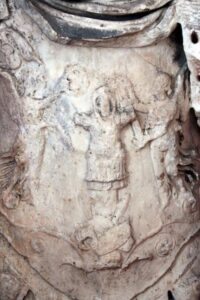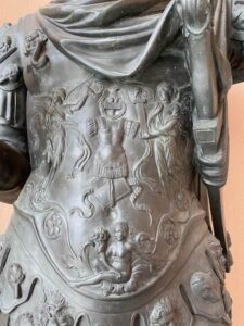 While the Ringling bronze largely captures the pose of the marble figure and features the same attributes, the most convincing point of comparison is in the decoration of the breastplate (figs. 4-5). Both bronze and marble versions show two winged victories – goddesses personifying victory in ancient Roman mythology – each wearing a long tunic (chiton) and adorning a war trophy (tropaion) situated between them. The victory on the left holds a palm branch and wreath – in the bronze version she faces outward but in the marble her back is turned – while the one on the right holds a sheathed sword with both hands. No other ancient marble statue has been found with a decorated breastplate of the same scheme, nor are victories in this context usually depicted carrying sheathed swords. This would suggest that the artist responsible for executing the bronze was familiar with the Grimani marble firsthand. It also makes it unlikely that elements from a number of different ancient marble statues were culled to create a pastiche.