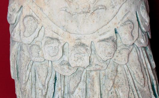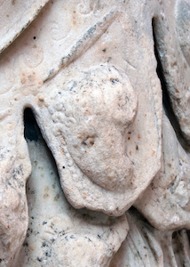 Further similarities between the bronze and marble are to be found in the double row of pteruges, the decorated strips situated below the breastplate and falling at the figure’s waist. In the marble, the figures on either side of the central strap mirror each other (fig. 6). The figures in the bronze do not correspond to those in the marble, nor are they arranged with the same symmetry or rendered in a similar style, but certain elements of the scheme do remain constant. In both versions, heads of mythological figures appear on either side of the central strap; for the marble, two gorgons, and in the case of the bronze, a gorgon and a head of the god Jupiter. The next figures moving outwards show animal heads; ram heads in the marble and wolf heads in the bronze.